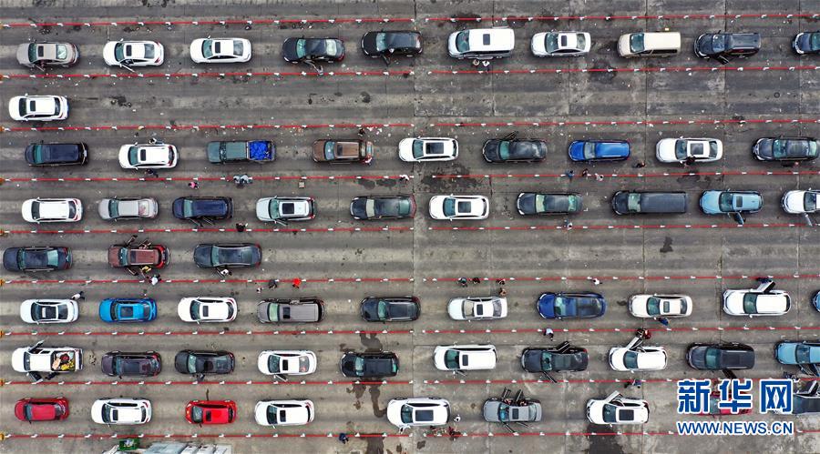 1月19日,车辆在海口秀英港轮渡码头等待登船(无人机照片)。 新华社记者 郭程 摄