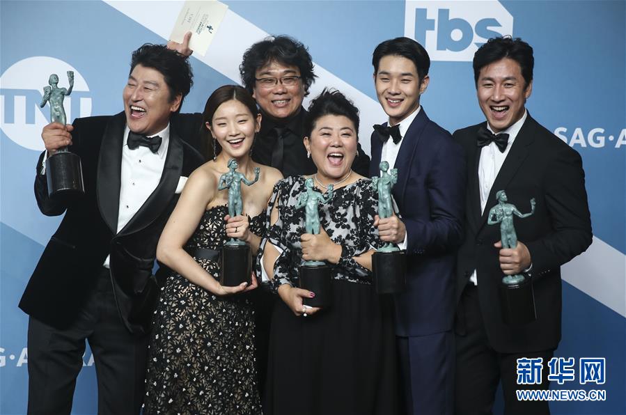 1月19日,在美国洛杉矶,韩国黑色喜剧片《寄生虫》主创人员展示奖杯。 新华社记者 李颖 摄