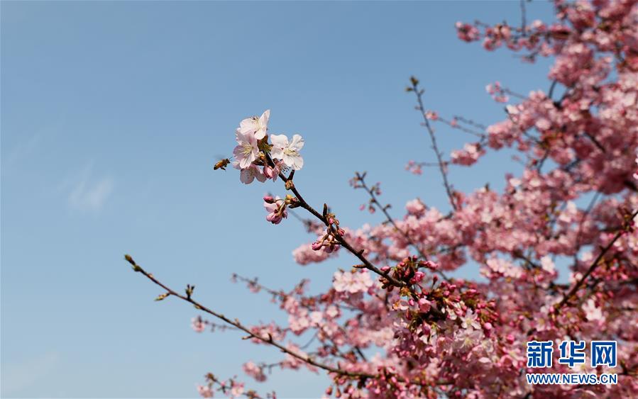 2月24日,在上海松江辰山植物园,蜜蜂在河津樱樱花丛中飞舞。 新华社记者 方喆 摄