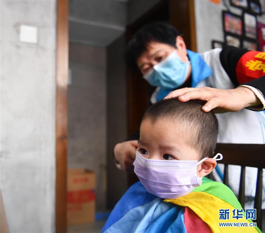2月24日,邹勤敏在南昌市青山湖区商苑社区服务中心为一名小朋友理发。