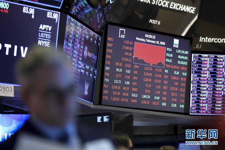 2月24日,美国纽约证券交易所的电子屏显示当天收盘情况。新华社记者 王迎 摄