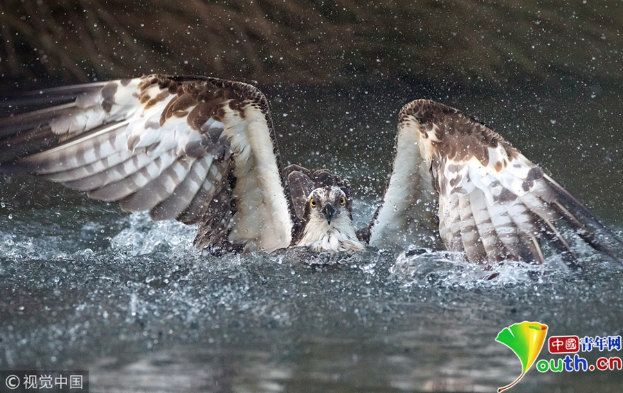 一只鱼鹰潜入湖中捉鳟鱼,激起巨大的水花。