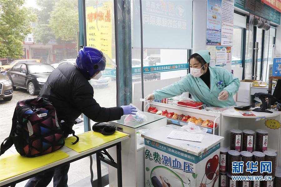 2月22日,王春波将药品递给前来买药的外卖骑手。王春波是武昌天济大药房锦绣江南店的一名店员,在武汉下达“所有小区全面实施封闭管理”的禁令之后,很多居民买药成了麻烦事,尤其是独居的老年人。她知道后,主动联系物业告知大家,如果有需要,她可以上门送药。现在,她和同事每天要派送100多单药品,大部分都是“三高人群”服用的药。很多顾客很感激王春波,“幸亏你们一直开业,东西也齐全,一分钱都没涨!”王春波说:“关键时期,大家都是在相互帮忙,这就是很平常、很普通的一件事。”新华社记者熊琦摄