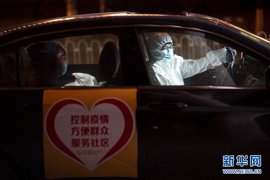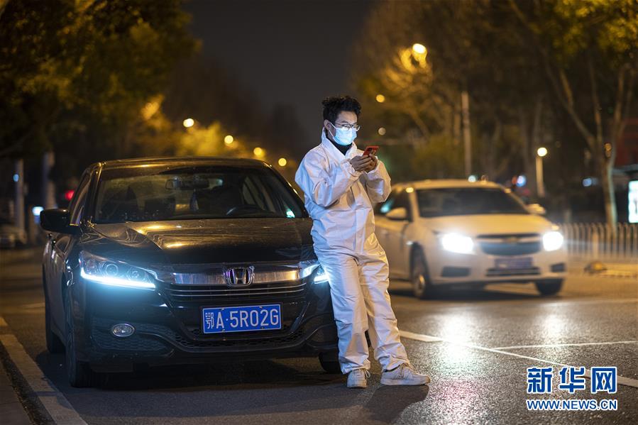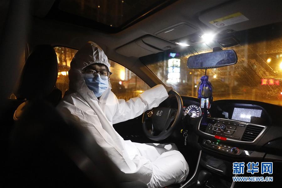 2月21日,王永朋在路边等待,准备接单。这个春节王永朋没回老家甘肃安阳,他报名担任高德医护专车志愿者,开着年前刚买的新车,免费接送医护人员上下班。因为住在武汉新洲区,距离江汉、武昌等老城区有相当一段车程,他每天早上6点就起床出车,晚上十一二点才能回家休息,一天接送几十位医护人员上下班。每次到达目的地,医生和护士下车后做的第一件事,总是向他致谢,还有不少人硬要塞钱给他,穿着防护衣、戴着口罩和护目镜的王永朋,每次都微笑着退回了。新华社记者熊琦摄