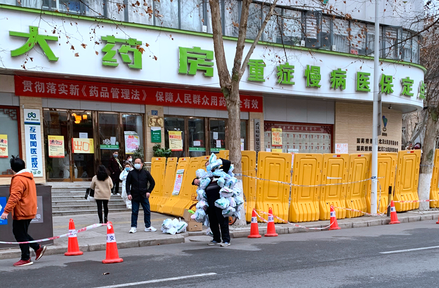 2月22日,王春波从药店出发,给周边小区的居民送药。新冠肺炎疫情防控工作启动以来,在决战之地武汉,有一群“平民英雄”默默付出鲜为人知。他们虽不是医护人员,但也活跃在城市抗击疫情的各个战线上,力所能及地帮助他人,义无反顾的坚守自己的“战场”,为抗击疫情加油助力。近日,记者走近这群“平民英雄”,用镜头记录下他们不平凡的身影。新华社记者熊琦摄
