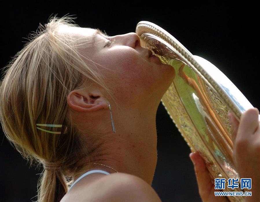 图为2004年7月3日,莎拉波娃在温布尔登网球锦标赛女单决赛中战胜美国选手小威廉姆斯,夺得冠军。