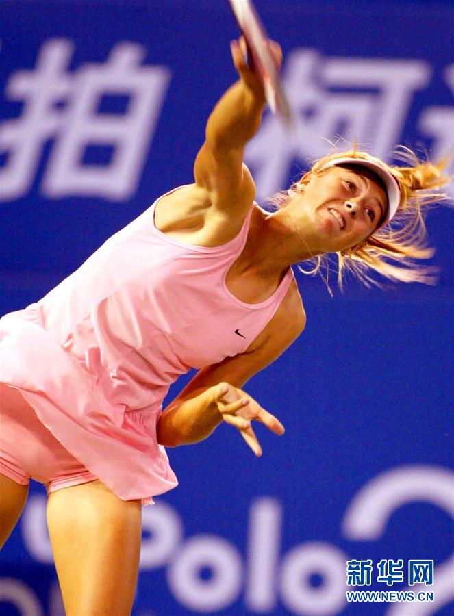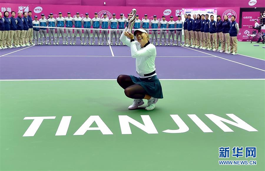 图为2017年10月15日,莎拉波娃在2017年WTA天津网球公开赛单打决赛中战胜白俄罗斯选手萨巴伦卡,获得冠军。 新华社记者岳月伟摄