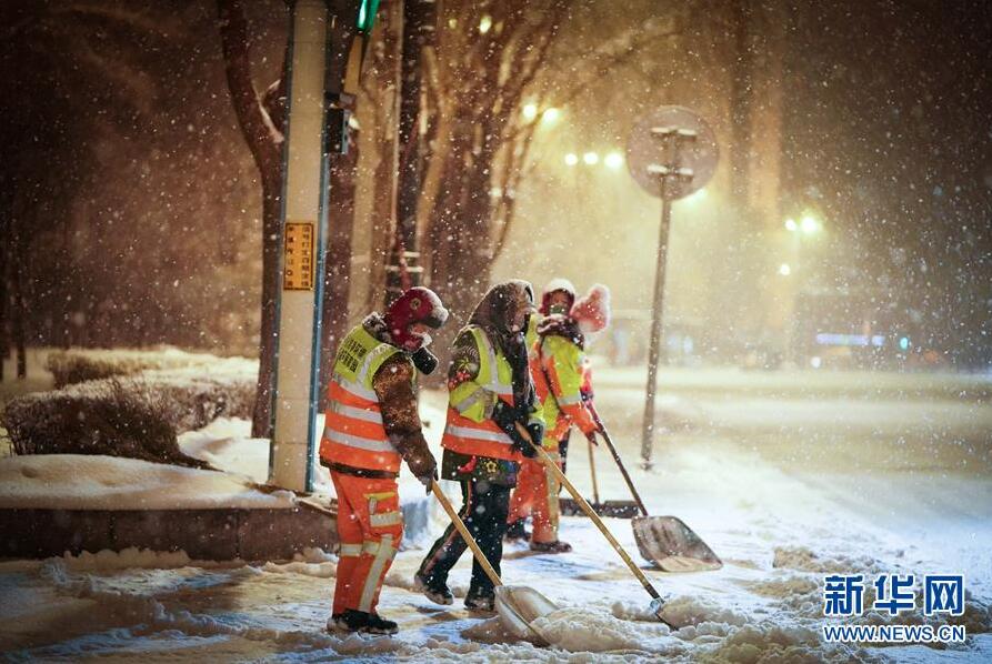 2月28日,环卫工人在哈尔滨市的道路上清理积雪。