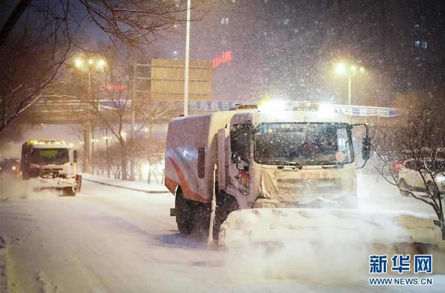 2月28日,清雪车辆在哈尔滨市的一条马路上作业。新华社记者 王松 摄