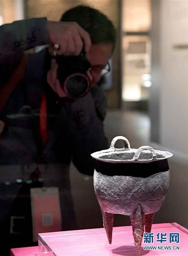 参观者在二里头夏都遗址博物馆拍摄展品“网格纹铜鼎”(2019年10月19日摄)。新华社记者李安摄