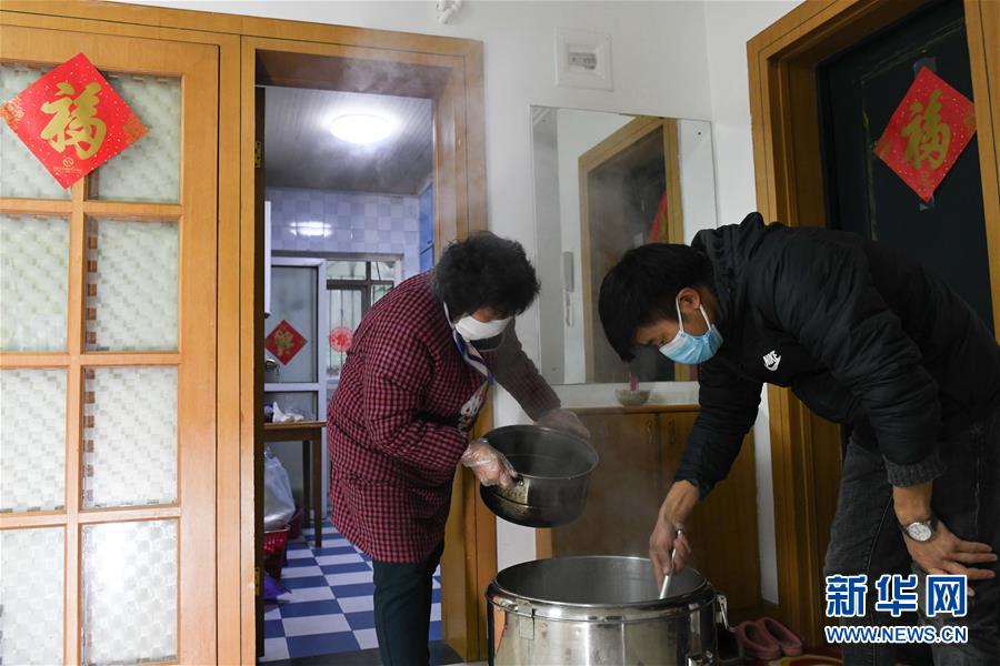 2月28日,张兰英将做好的粥倒入保温桶,准备由儿子徐晓军(右)送给疫情防控人员。新华社记者张端摄
