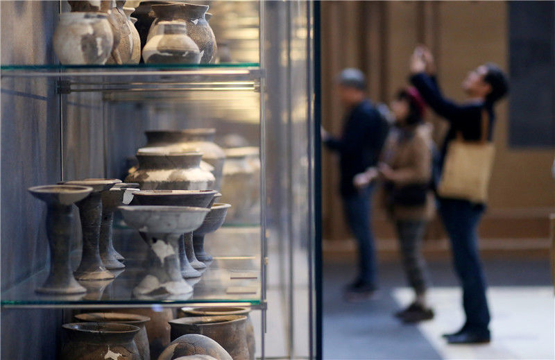 2019年10月19日,河南洛阳,二里头夏都遗址博物馆。观众在参观陶器展。