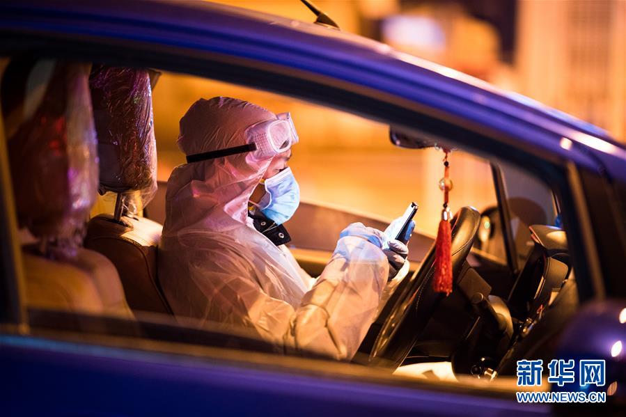 2月29日凌晨,王震在车内查看出车信息。新华社记者 肖艺九 摄