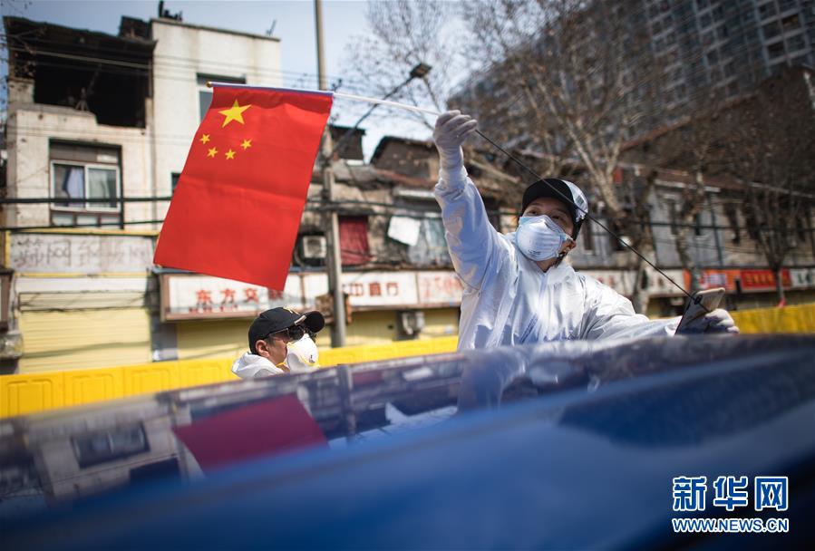 2月29日,W大武汉紧急救援队队长王紫懿(右)将国旗插在车上。 新华社记者 肖艺九 摄
