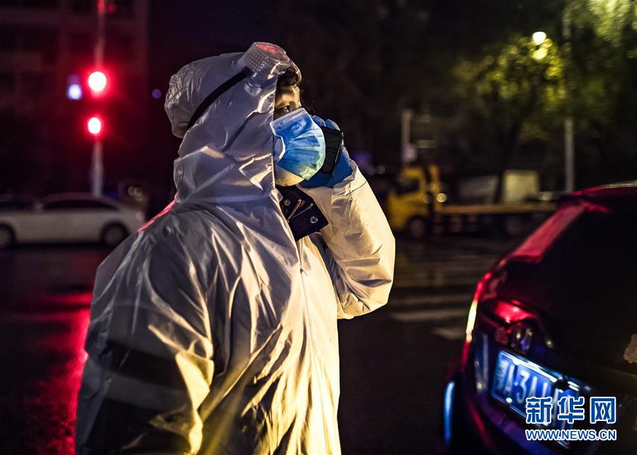 2月29日凌晨,王震到达约定地点后和产妇刘婷家属联系。新华社记者 肖艺九 摄