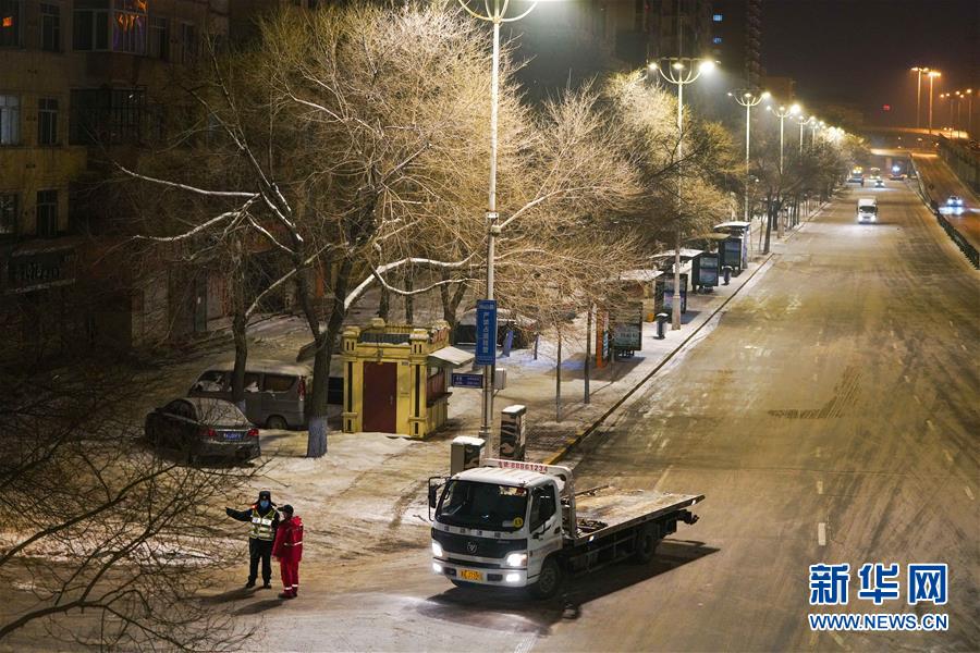 李可心(左)在出入口值守(3月1日摄)。 新华社记者王松摄