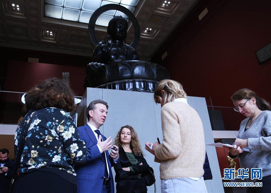 3月2日,在法国巴黎,赛努奇亚洲艺术博物馆馆长埃里克·勒菲弗(左二)接受媒体采访。法国巴黎赛努奇亚洲艺术博物馆经过数月修缮后2日迎客,以更加丰富的展品、全新场景布置和多媒体呈现方式向观众展示中国文化和亚洲文化魅力。新华社记者高静摄