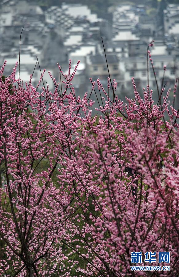 3月2日,盛开的春梅映衬着平利县长安镇高峰村徽派农舍。新华社记者陶明摄