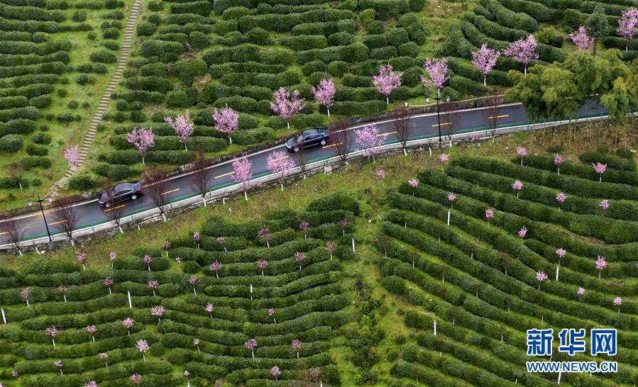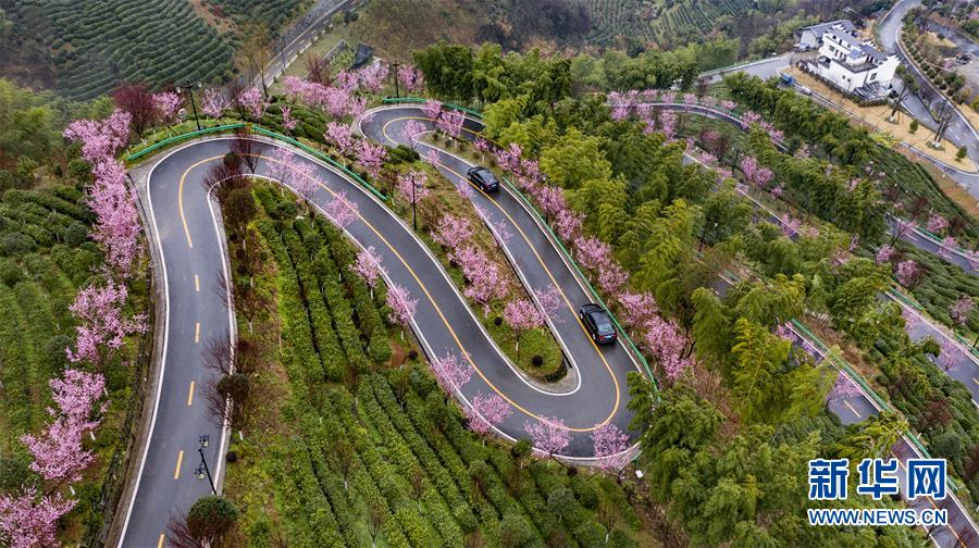 这是3月2日拍摄的平利县长安镇洪福茶山,道路两旁的春梅盛开(无人机照片)。新华社记者陶明摄