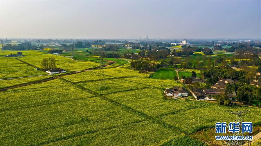 2月25日在四川省崇州市农业产业功能区拍摄的油菜花田(无人机照片)。初春时节,正值农时。成都平原西部的大邑、崇州等县市油菜长势良好,一片生机盎然的景象。新华社记者王曦摄
