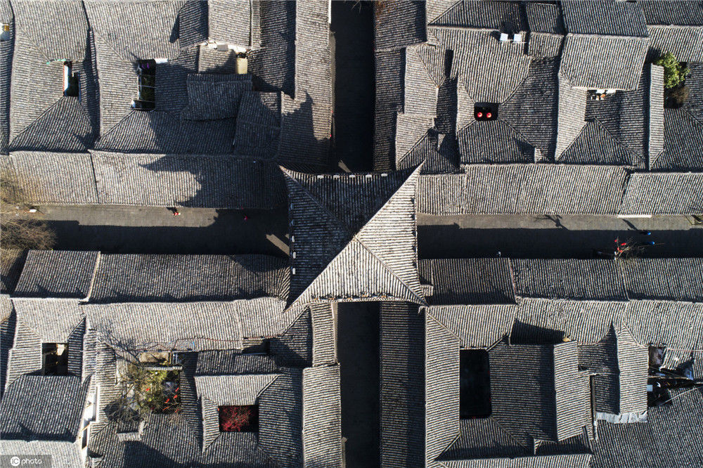 2020年2月21日,四川南充阆中古城中天楼旁,张家小院天井中的海棠在阳光中绽放(无人机拍摄)。
