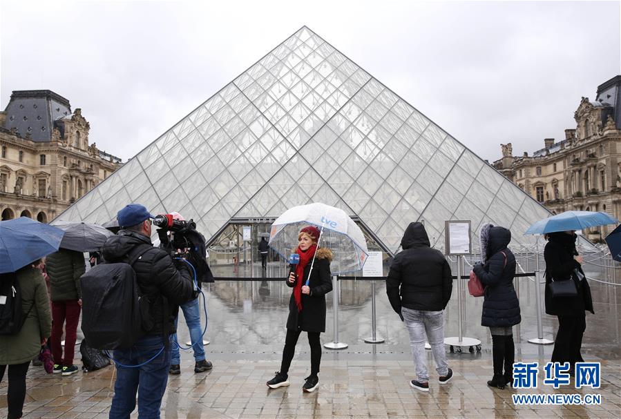 3月2日,在法国巴黎,记者在卢浮宫博物馆外工作。