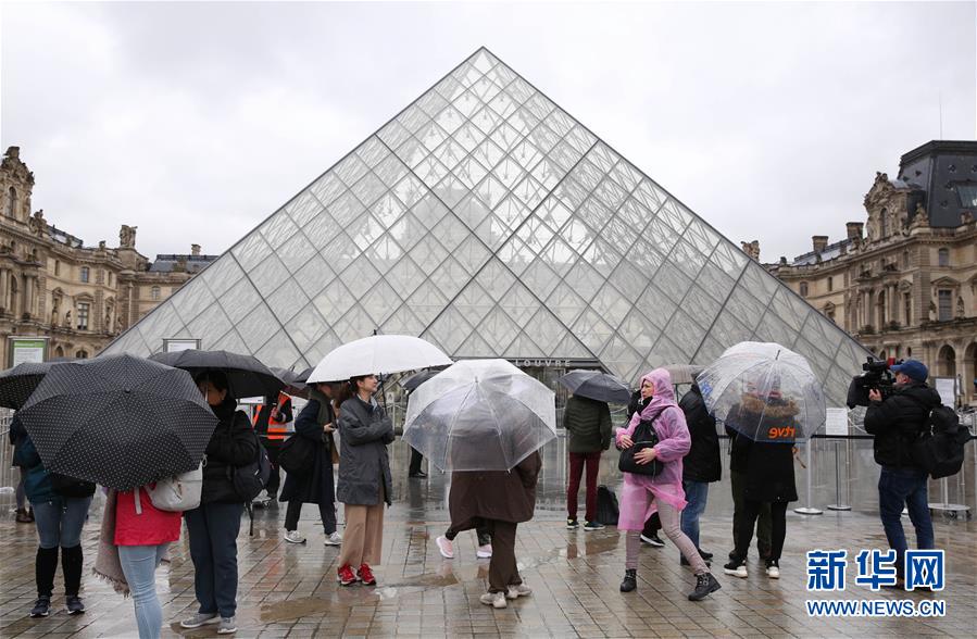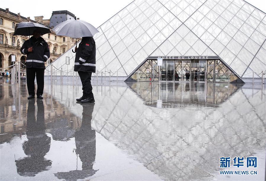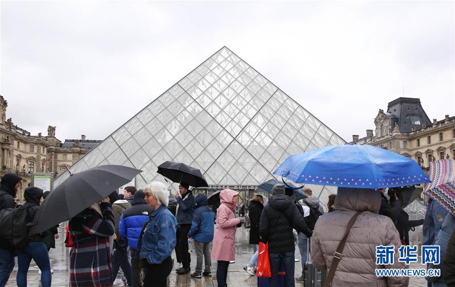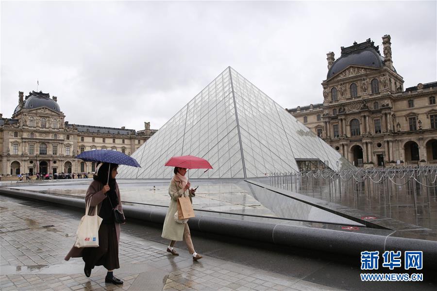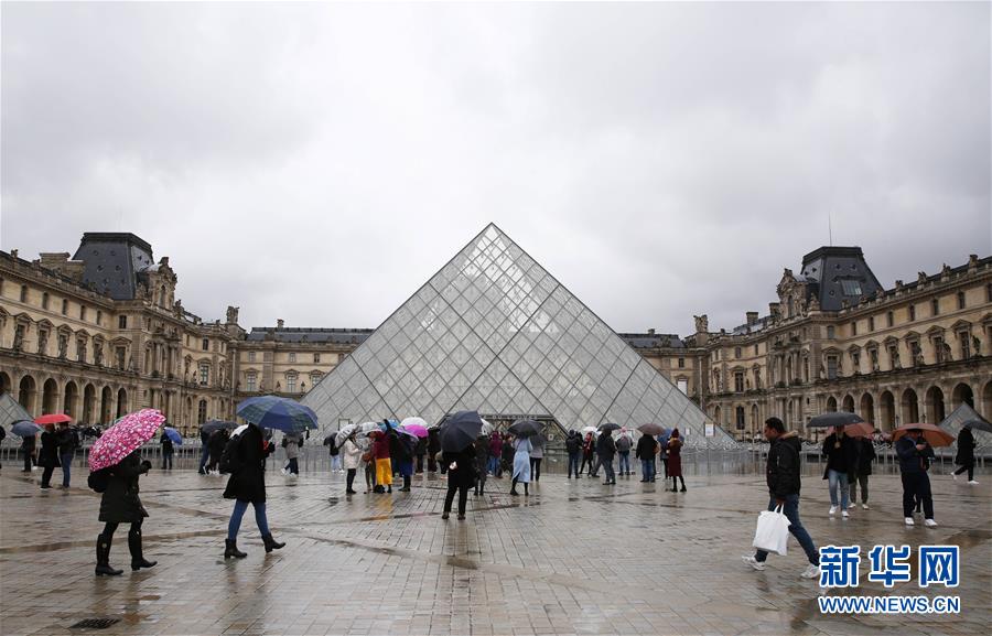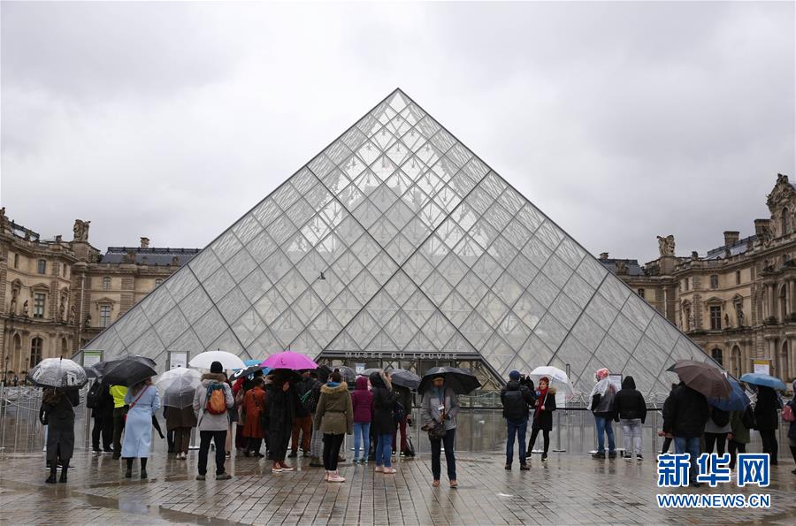 3月2日,在法国巴黎,游客撑伞走过卢浮宫的玻璃金字塔。新华社记者 高静 摄