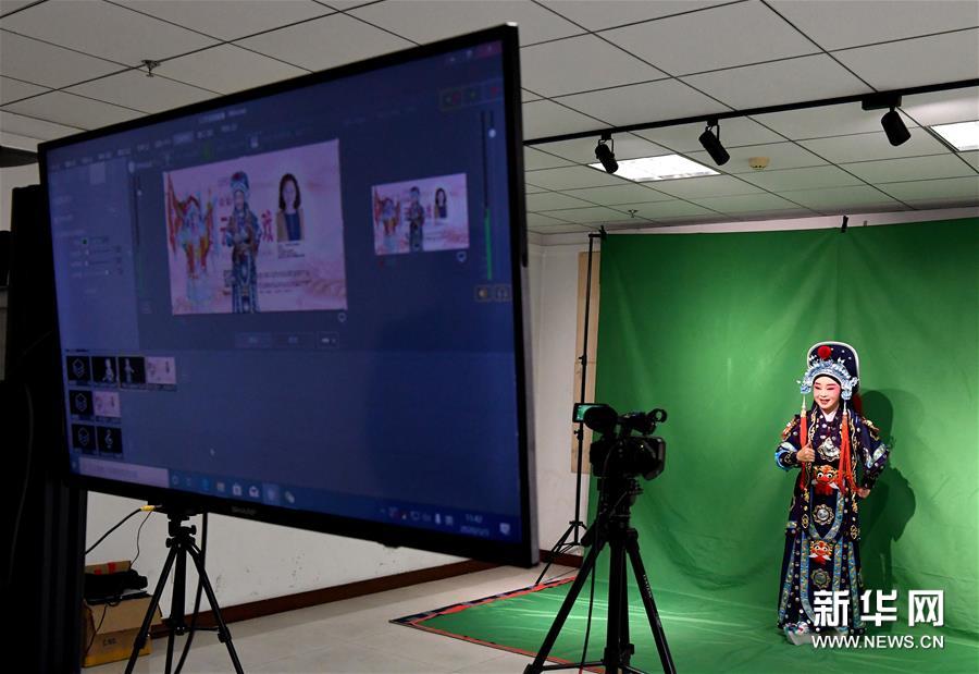 3月3日,李金玲在郑州文化馆通过直播的形式进行带妆表演豫剧《花木兰》选段。新华社记者 李安 摄