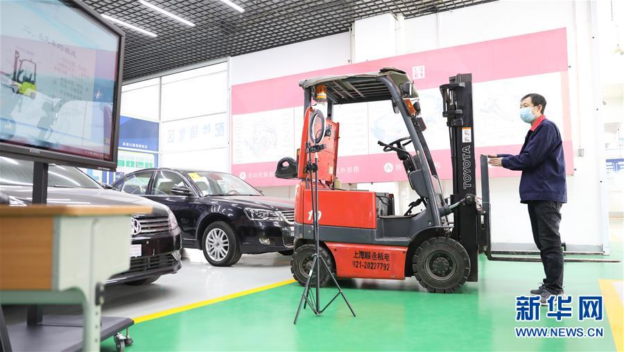 3月4日,职教城内的鞍山市交通运输学校的杨永祥老师为学生进行物流叉车实训网络授课。辽宁省鞍山市职教城内的各类职业教育学校从3月2日恢复网络授课以来,教师们设置了丰富多彩的课程,提高1万余名学生线上学习的积极性。新华社记者 姚剑锋 摄
