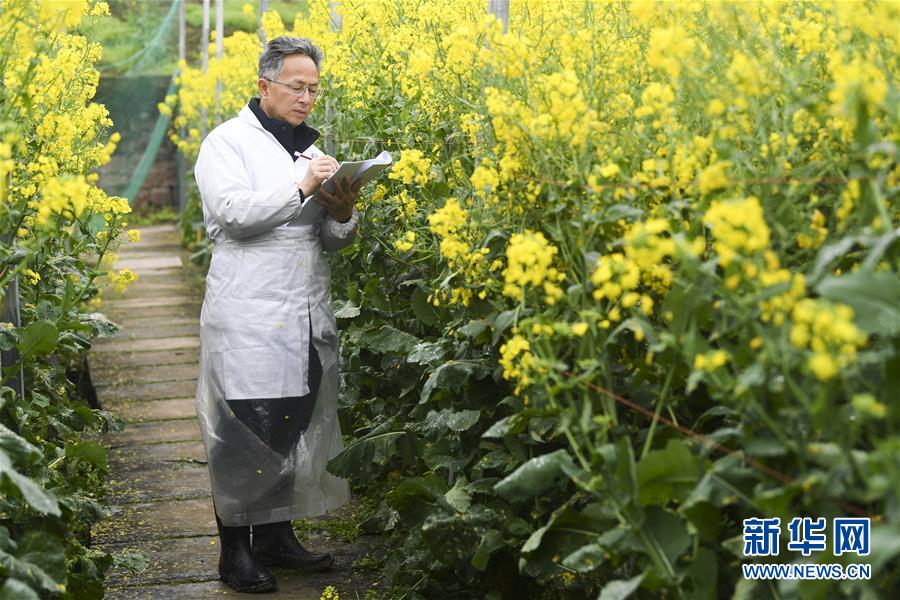 3月5日,重庆市油菜工程技术研究中心负责人李加纳教授在观察记录油菜生长情况。时下正值油菜花期,重庆市油菜工程技术研究中心的农学专家带领学生和技术工人抢抓农时,推进油菜科研和育种工作。新华社记者 王全超 摄