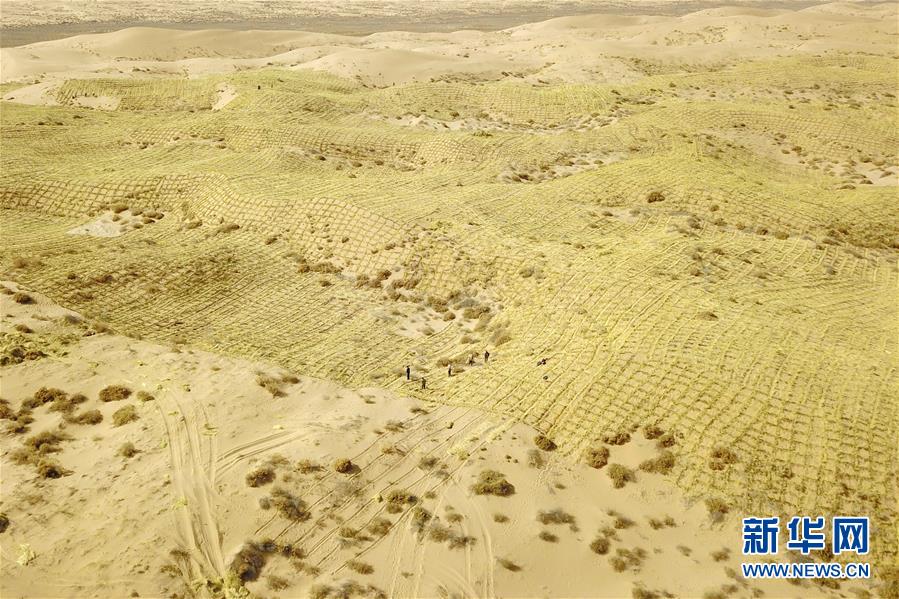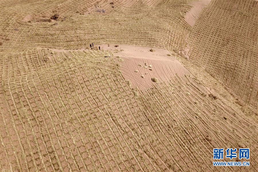 3月5日,在古浪县北部沙区旱麻岗治沙点,群众扎草方格压沙(无人机照片)。初春时节,在腾格里沙漠南缘的甘肃省武威市古浪县,当地干部职工及八步沙林场治沙人共同在县城北部沙区旱麻岗治沙点开展春季治沙劳动。新华社记者 范培珅 摄