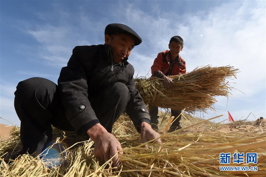 3月5日,在古浪县北部沙区旱麻岗治沙点,八步沙林场第二代治沙人郭万刚(左)和第三代治沙人郭玺扎草方格压沙。初春时节,在腾格里沙漠南缘的甘肃省武威市古浪县,当地干部职工及八步沙林场治沙人共同在县城北部沙区旱麻岗治沙点开展春季治沙劳动。新华社记者 范培珅 摄