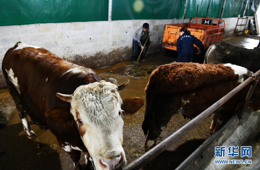 在贵州省铜仁市德江县平原镇坳田村,养殖户在坳田畜牧养殖农民专业合作社清理牛舍(2月29日摄)。新华社记者 杨文斌 摄