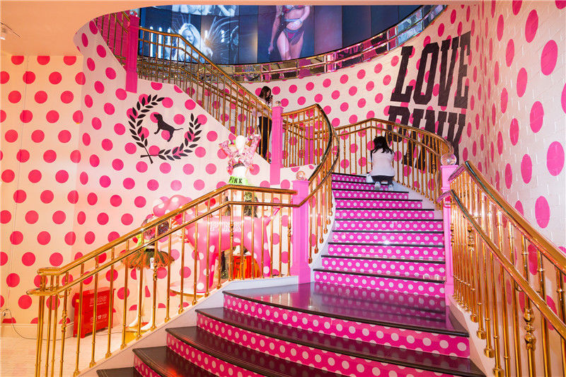 2018年5月17日,北京王府井维密旗舰店。店内旋梯很漂亮,上下一共3层,1、2层巨大的环形电视墙,播放着维密超模走秀的视频,地下一层粉嫩的风格粉嫩,充满了少女心。刘锋/千龙图像/视觉中国