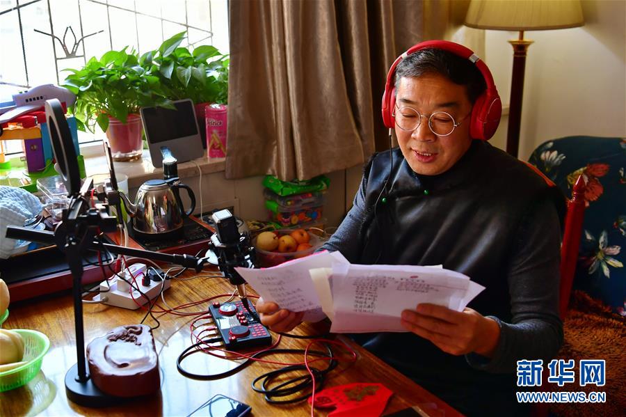 武凌云在直播中为戏迷讲解剧本的创作过程(3月5日摄)。 新华社记者 曹阳 摄