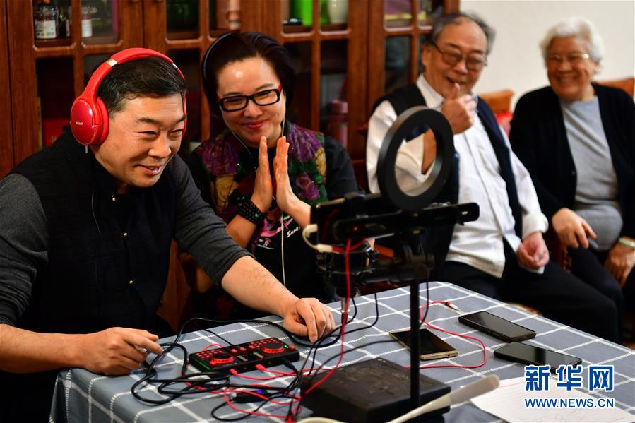 武凌云(左一)在直播中表演晋剧片段(3月6日摄)。 新华社记者 曹阳 摄