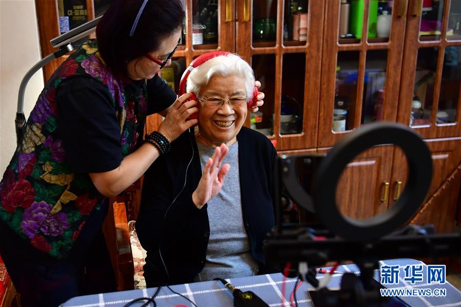 阎惠贞(右)在和直播平台的戏迷打招呼(3月6日摄)。 新华社记者 曹阳 摄