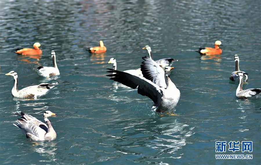 拉萨宗角禄康公园湖中嬉戏的鸟儿(3月10日摄)。 随着气候回暖,西藏的春天悄然到来。在“日光城”拉萨,高原大地从寒冬中渐渐醒来。 新华社记者 觉果 摄