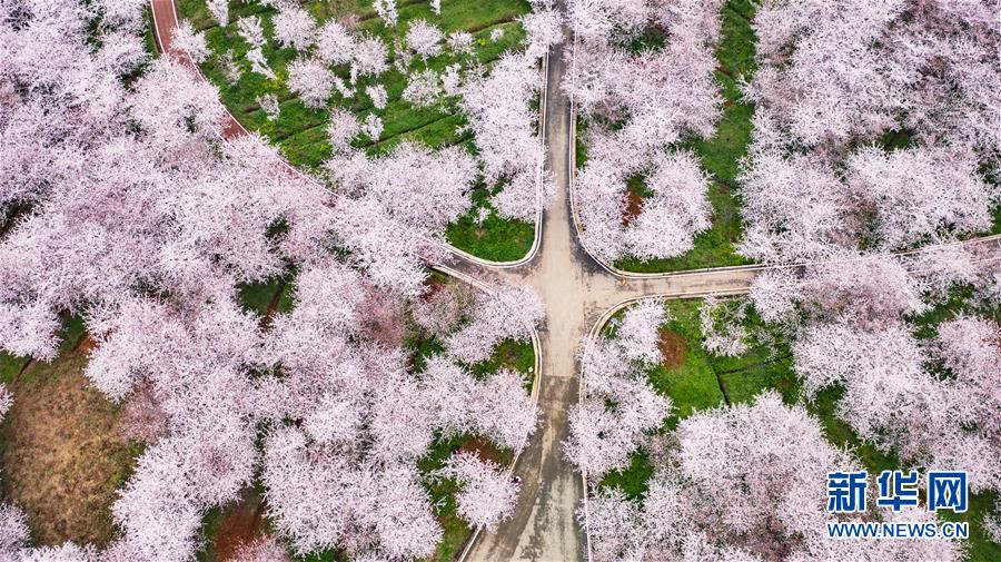 3月12日拍摄的贵安新区樱花观光园风景(无人机照片)。 近日,贵州省贵安新区樱花观光园内樱花竞相盛开,花团锦簇间春意盎然。据介绍,疫情防控期间,为避免人群聚集,樱花园暂不接待游客。 新华社记者 陶亮 摄