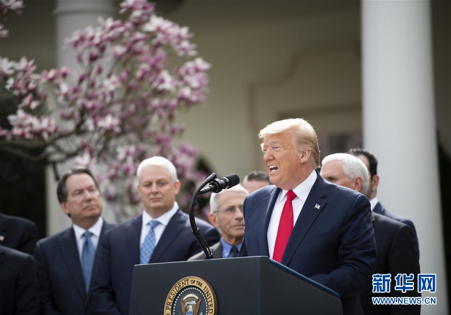 3月13日,美国总统特朗普(前)在华盛顿白宫的记者会上讲话。特朗普当天下午在白宫发表讲话时正式宣布“国家紧急状态”。他说,此举旨在让美国联邦政府全力投入到抗击新冠肺炎疫情的努力中。这项举措将释放500亿美元资金,帮助各州和地方政府应对疫情。新华社记者刘杰摄