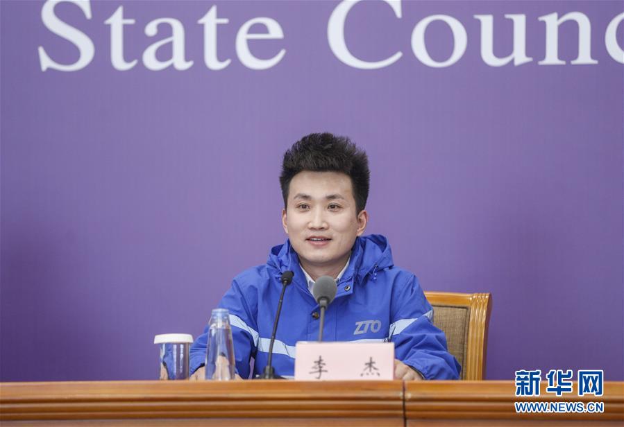 3月9日,中通快递北京厂洼路网点快递员李杰在北京出席国务院联防联控机制新闻发布会。