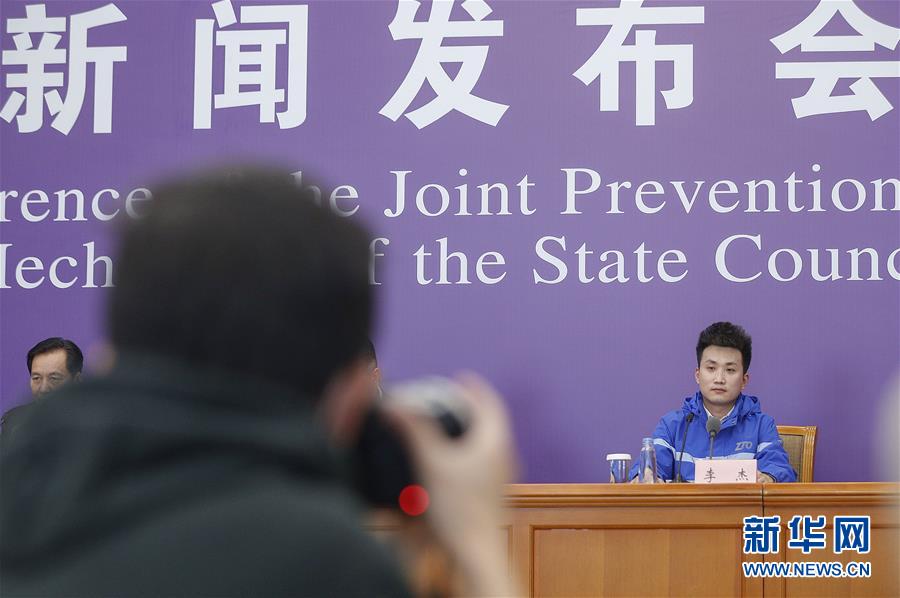 3月9日,中通快递北京厂洼路网点快递员李杰在北京出席国务院联防联控机制新闻发布会。新华社记者张玉薇摄