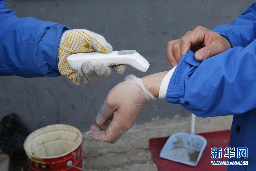 3月12日,李杰在中通快递北京厂洼路网点上岗前检测体温。新华社记者张玉薇摄