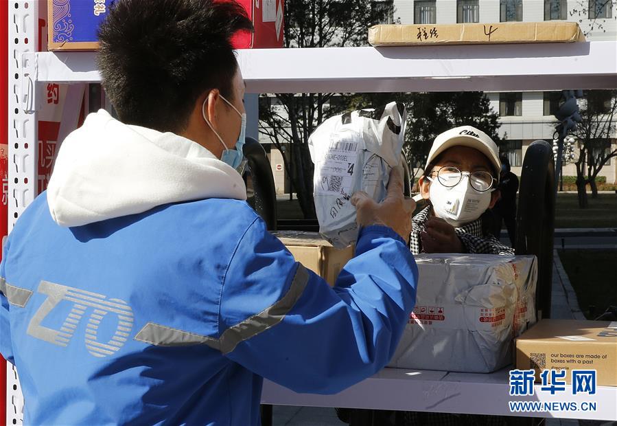 3月12日,李杰(左)在中国青年政治学院快递点隔着栅栏给客户递送包裹。新华社记者张玉薇摄