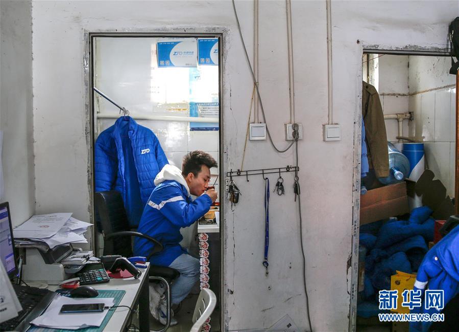 3月12日,李杰利用午休间隙在厂洼路网点吃午饭。新华社记者张玉薇摄