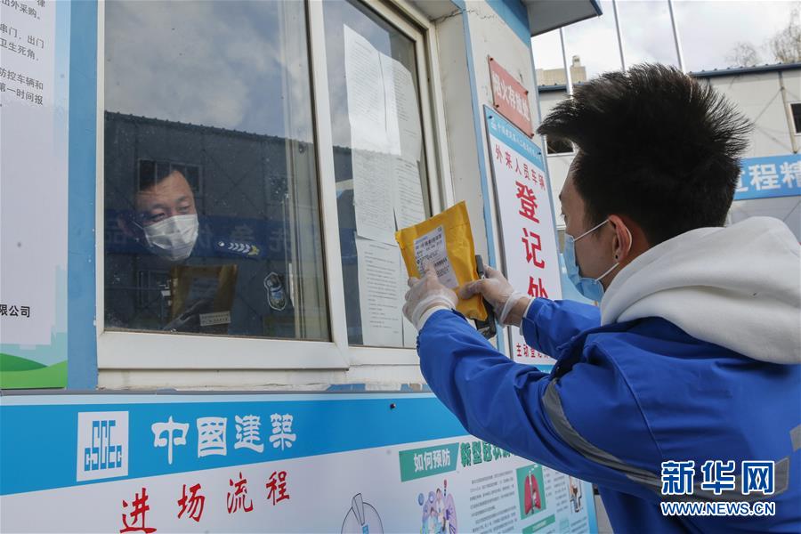 3月12日,李杰(右)在一个投递点向传达室工作人员询问收件人的信息。新华社记者张玉薇摄
