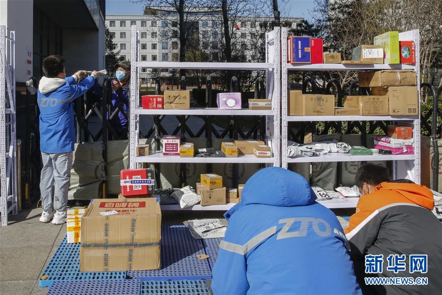 3月12日,李杰(左一)在中国青年政治学院快递点隔着栅栏给客户递送包裹。新华社记者张玉薇摄