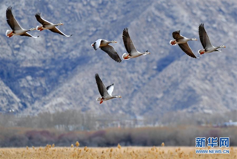 3月14日,斑头雁在拉鲁湿地上空飞翔。新华社记者张汝锋摄