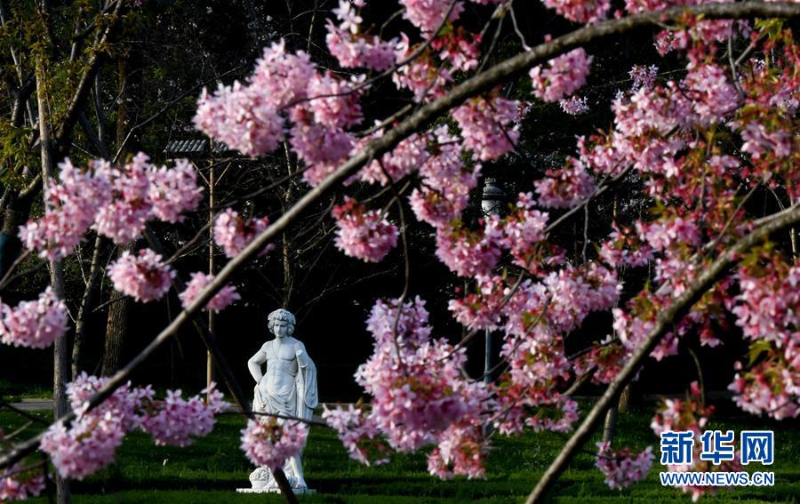 这是3月14日拍摄的武汉东湖磨山樱园景色。近日气温渐升,武汉东湖磨山樱园里的樱花渐次盛开,带来春天的气息。新华社记者熊琦摄