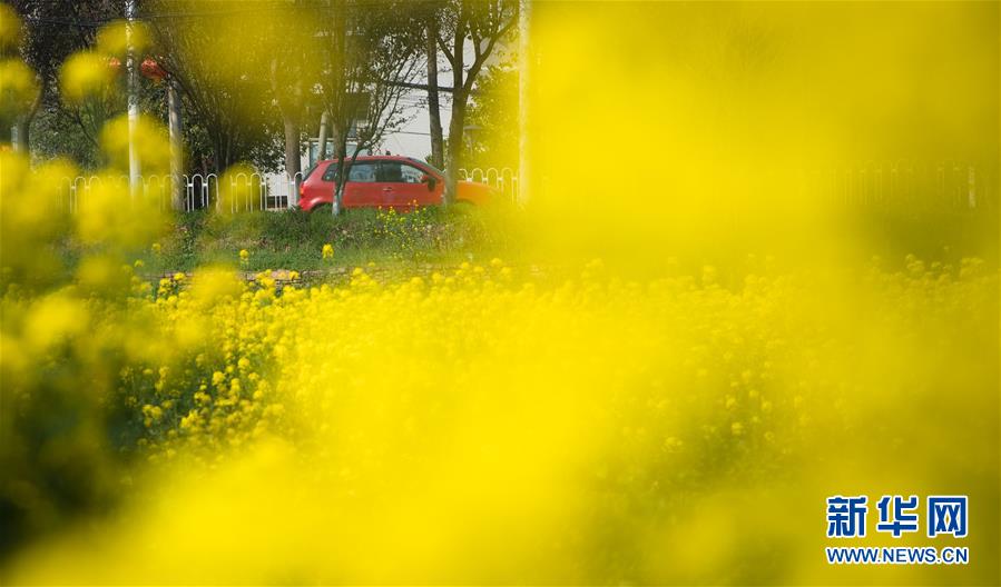 3月14日,在武汉市西北部市郊,一辆汽车从油菜花田前驶过。随着气温升高,春意在武汉的枝头上萌动,花朵渐次开放。新华社记者肖艺九摄